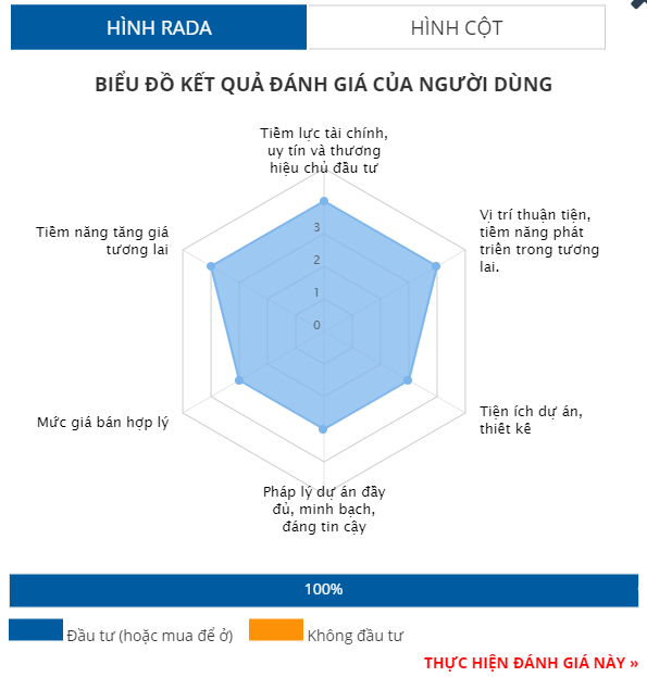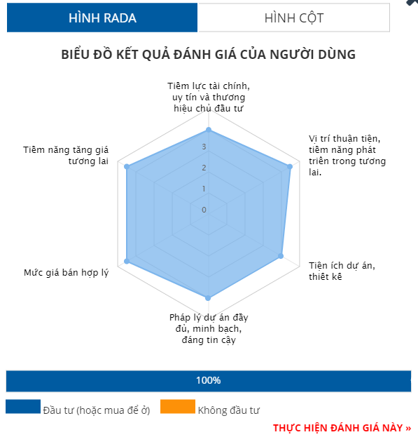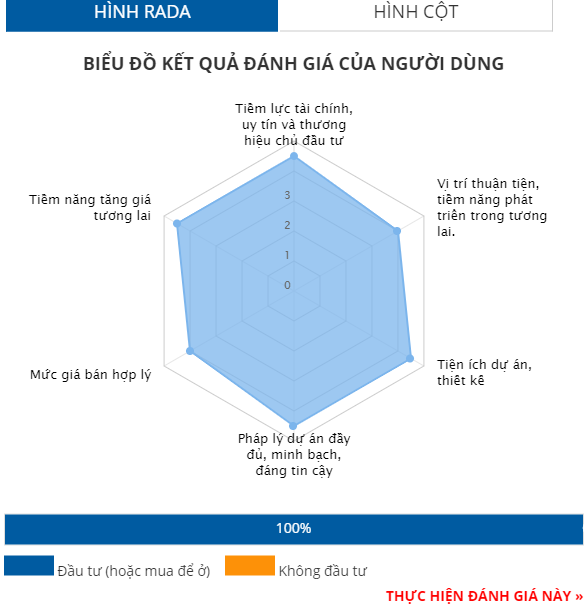 Đánh giá về dự án, độc giả chấm thang điểm 4/5 cho hai tiêu chí vị trí và mức giá. Các tiêu chí còn lại là tiềm lực, tiện ích, tiềm năng, pháp lý đạt 4,5/5 điểm.