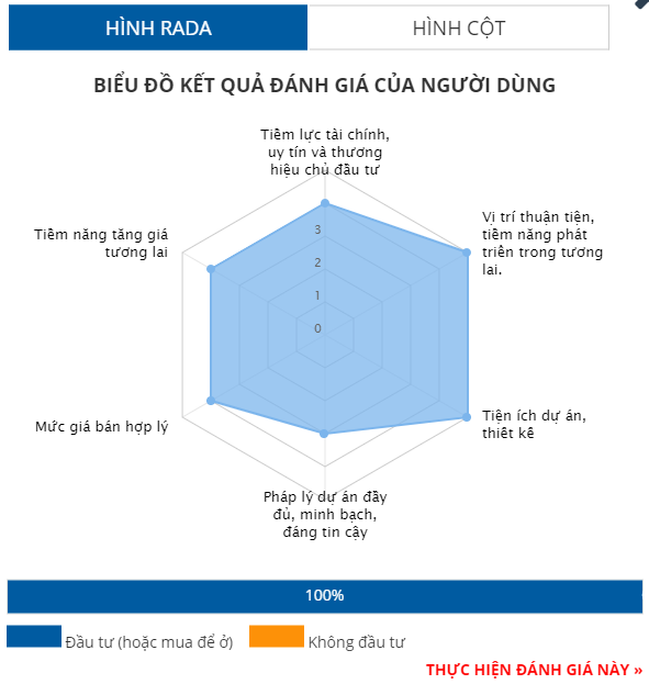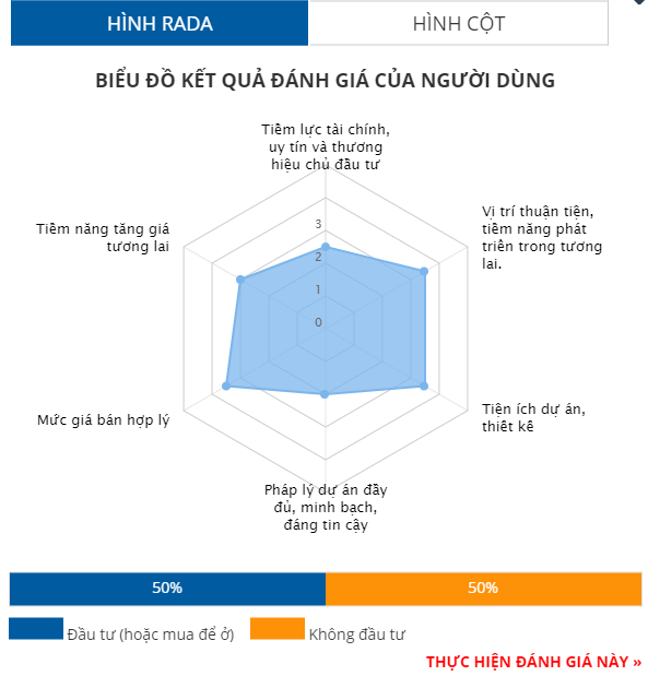 Mặc dù có mức giá không quá cao nhưng dự án vẫn được độc giả đánh giá ở mức điểm trung bình 3,5/5. Trong khi đó, tiêu chí pháp lý chỉ đạt 2/5, tiêu chí tiềm lực đạt 2,5/5, các tiêu chí còn lại lần lượt là tiềm năng 3/5, vị trí 3,5/5 và tiện ích là 3,5/5.