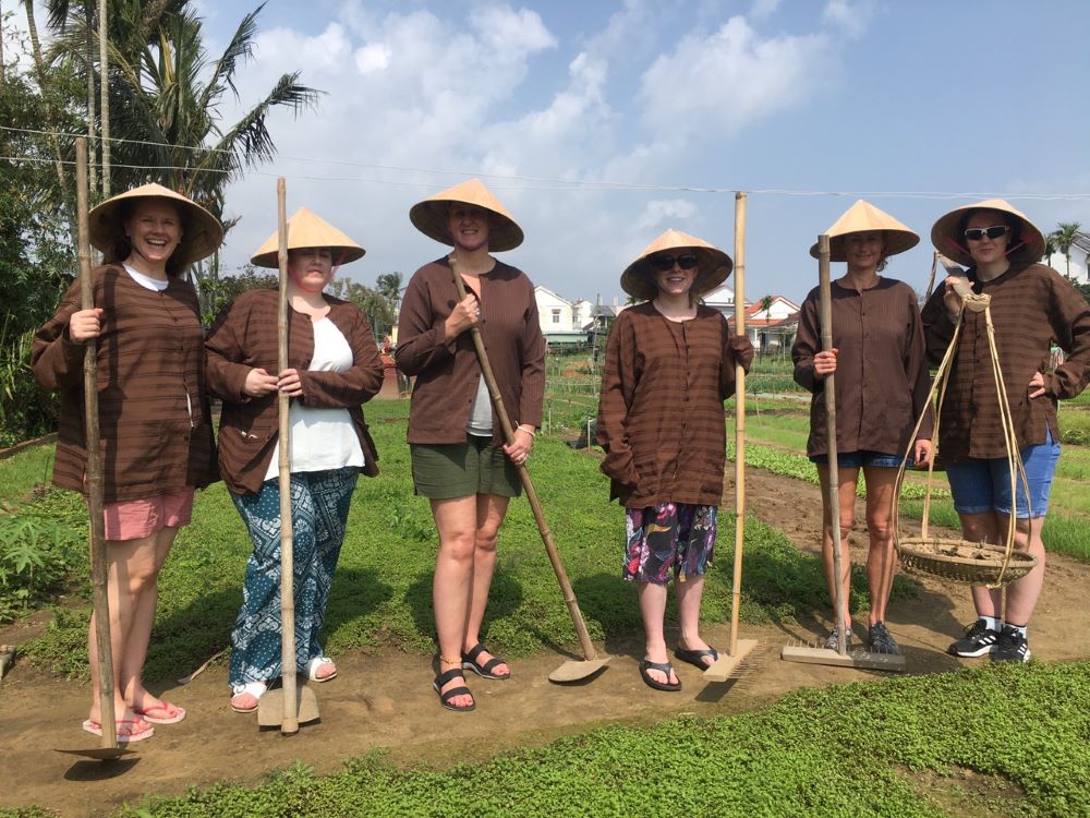 Du khách quốc tế tham quan, trải nghiệm làm nông dân tại làng rau Trà Quế, Hội An. Ảnh: L.B