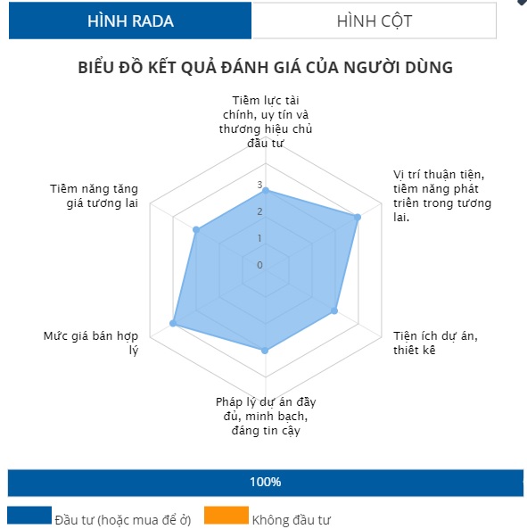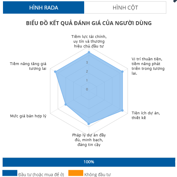 Với nhiều tiện ích, dự án đang được đánh giá rất cao về các tiêu chí. Cụ thể tất cả các tiêu chí vị trí, tiềm năng, tiềm lực, giá bán, pháp lý, tiện tích đều được đánh giá ở thang điểm hơn 4,5/5. Đặc biệt, hai tiêu chí vị trí và pháp lý đạt gần như tuyệt đối 4,9/5.