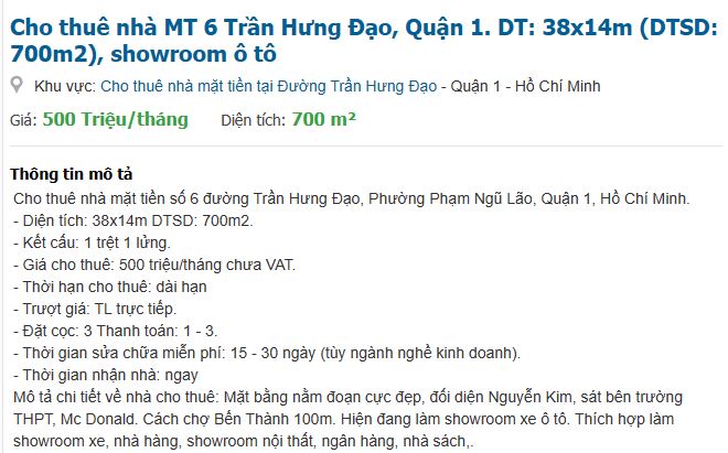 Trên các trang rao vặt nhà đất xuất hiện thông tin cho thuê mặt bằng có địa chỉ số 6 đường Trần Hưng Đạo (Quận 1, TP.HCM), cận kề ngã tư Trần Hưng Đạo – Yersin, cách chợ Bến Thành khoảng 100m.