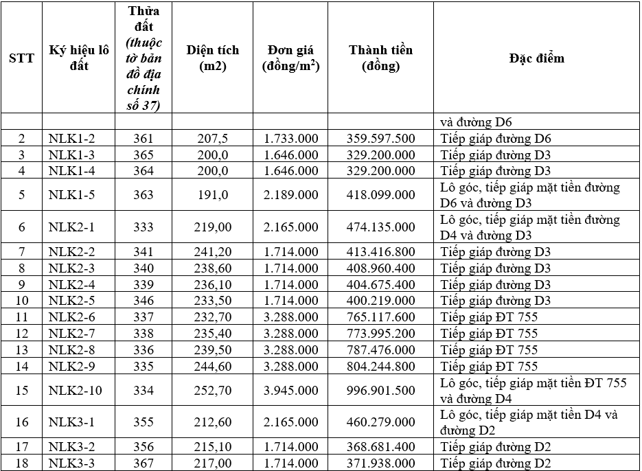 Tổng giá khởi điểm của 44 lô đất là hơn 19,7 tỉ đồng. Lô đất có mức giá khởi điểm thấp nhất chỉ từ hơn 300 triệu đồng có diện tích 170,5m2.