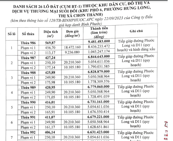 Ngày 23/10, Công ty Đấu giá Hợp danh Bình Phước sẽ tổ chức đấu giá quyền sử dụng 26 lô đất là tài sản của Trung tâm Phát triển quỹ đất thị xã Chơn Thành.