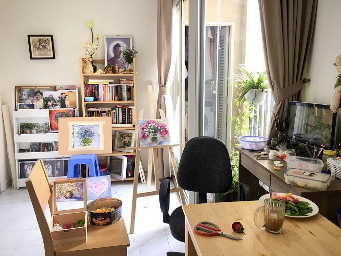 Phòng khách được chị tận dụng làm nơi vẽ và làm tranh đất sét.