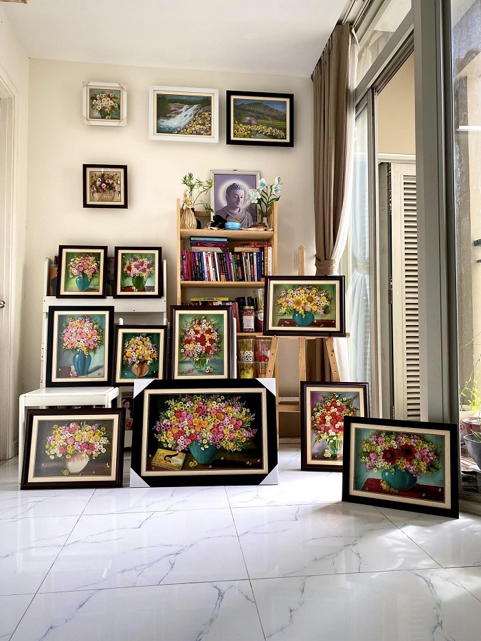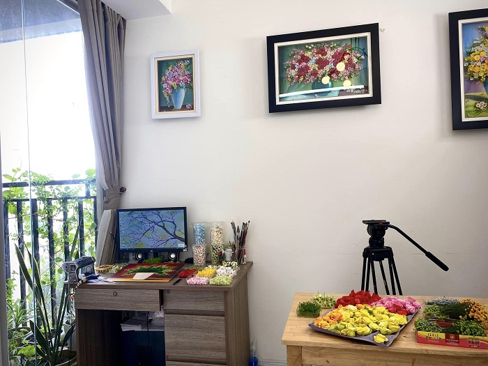 Chị Sinh cho biết, từ năm 2016 chị đã được học một lớp làm hoa bằng đất sét trong 1 tháng. Loại hình làm hoa này đã xuất hiện một thời gian dài trước đây tại Việt Nam. Tuy nhiên, chị Sinh đã nghĩ đến việc thử kết hợp hoa đất sét và tranh vẽ. Hiện tại chị luôn bận rộn với những đơn đặt hàng tranh của khách hàng.