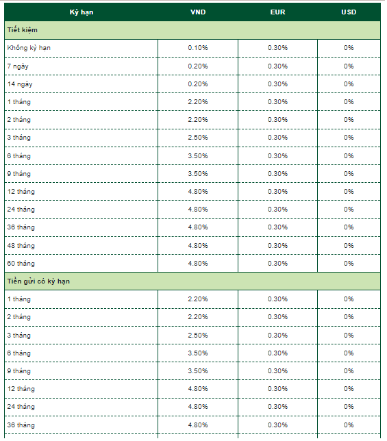 Còn đối với tiền gửi tại quầy kỳ hạn từ 12 tháng trở lên, Vietcombank giữ nguyên lãi suất 4,8%/năm. Đây cũng là mức lãi suất huy động cao nhất niêm yết lại ngân hàng này.
