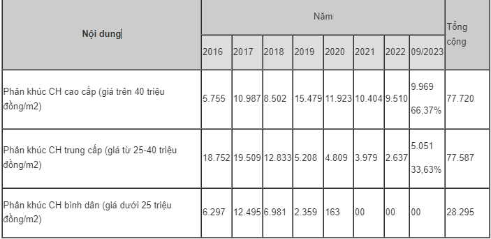 Đáng quan ngại là phân khúc nhà ở bình dân năm 2020 chỉ có 163 căn hộ chỉ chiếm tỷ lệ 1% và trong các năm 2021, 2022 và 9 tháng đầu năm 2023 thì không còn căn hộ nhà ở bình dân.