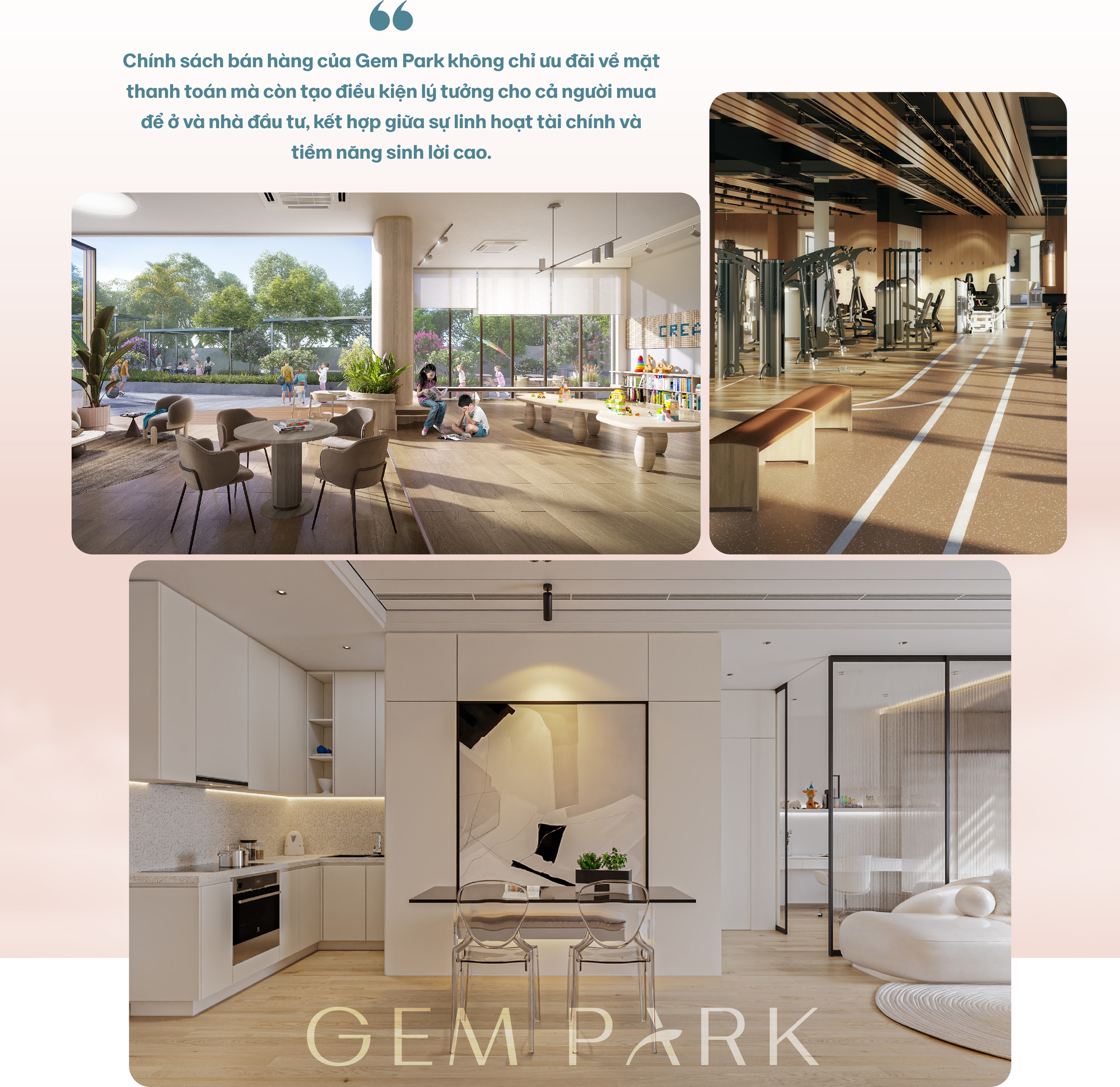 Từ nay cho đến khi nhận nhà cuối năm 2026, khách hàng mua căn hộ tại gem Park chỉ cần thanh toán 680 triệu đồng đối với căn hộ 2 phòng ngủ (2,6 tỷ). Trong thời gian 2 năm, khách hàng không cần phải vay ngân hàng, không chịu áp lực tài chính. Đối với các nhà đầu tư, chỉ cần bỏ ra số vốn ban đầu nhỏ, có thể cho thuê và thu về nguồn thu nhập ổn định từ 12 triệu/tháng hoặc nhận lợi nhuận đột phá nếu thanh khoản ở thời điểm bàn giao căn hộ.