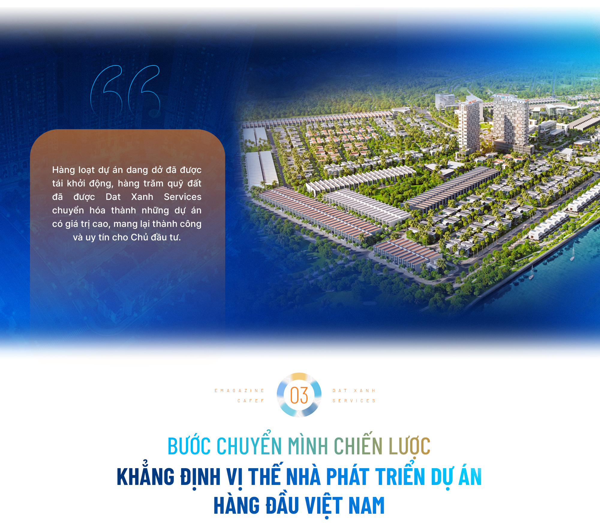 Tổng Giám Đốc Dat Xanh Services - Ông Trần Quốc Thịnh chia sẻ: "Chuyển đổi từ mô hình từ dịch vụ môi giới sang nhà phát triển dự án toàn diện, Dat Xanh Services sẽ hợp tác với Chủ đầu tư thông qua các dịch vụ để cùng phát triển dự án ngay từ khi dự án bắt đầu triển khai đến khi vận hành và trao tay tổ ấm cho khách hàng. Hiện đã có rất nhiều Chủ đầu tư đã tìm đến Dat Xanh Services để triển khai mô hình này".