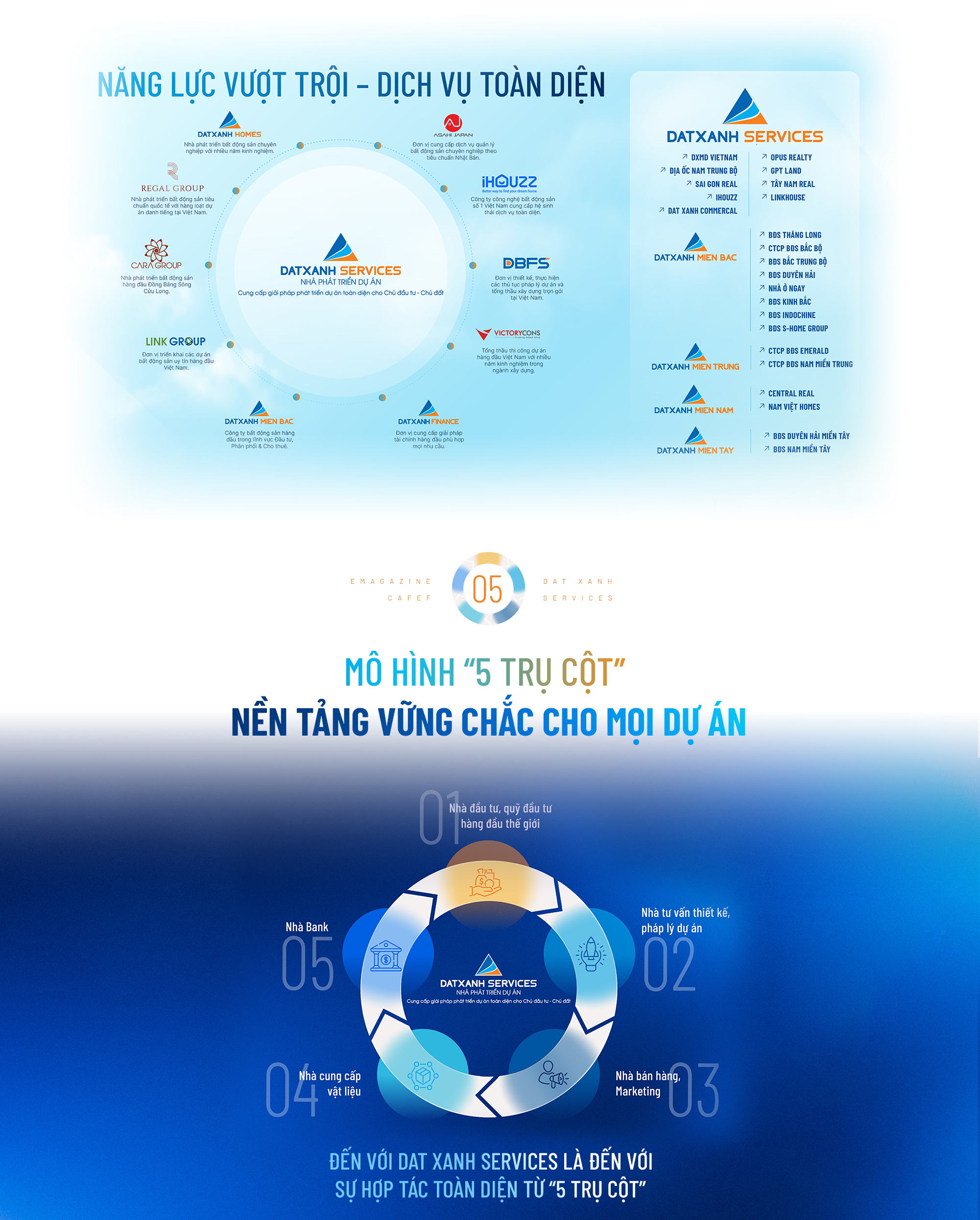 Với hệ sinh thái bất động sản khép kín hơn 40 công ty thành viên: Đất Xanh Miền Bắc, Đất Xanh Miền Trung, Đất Xanh Miền Tây…và đội ngũ chuyên gia dày dạn kinh nghiệm, cùng hơn 15.000 chuyên viên kinh doanh và cộng tác viên, hơn 350 đối tác, đại lý phân phối chiến lược trên khắp mọi miền đất nước, Dat Xanh Services sở hữu sức mạnh cộng hưởng và dịch vụ toàn diện. Lợi thế này giúp Dat Xanh Services kiểm soát toàn bộ quy trình, cung cấp giải pháp phát triển dự án toàn diện và mang đến những lợi ích vượt trội cho Chủ đầu tư – Chủ đất.