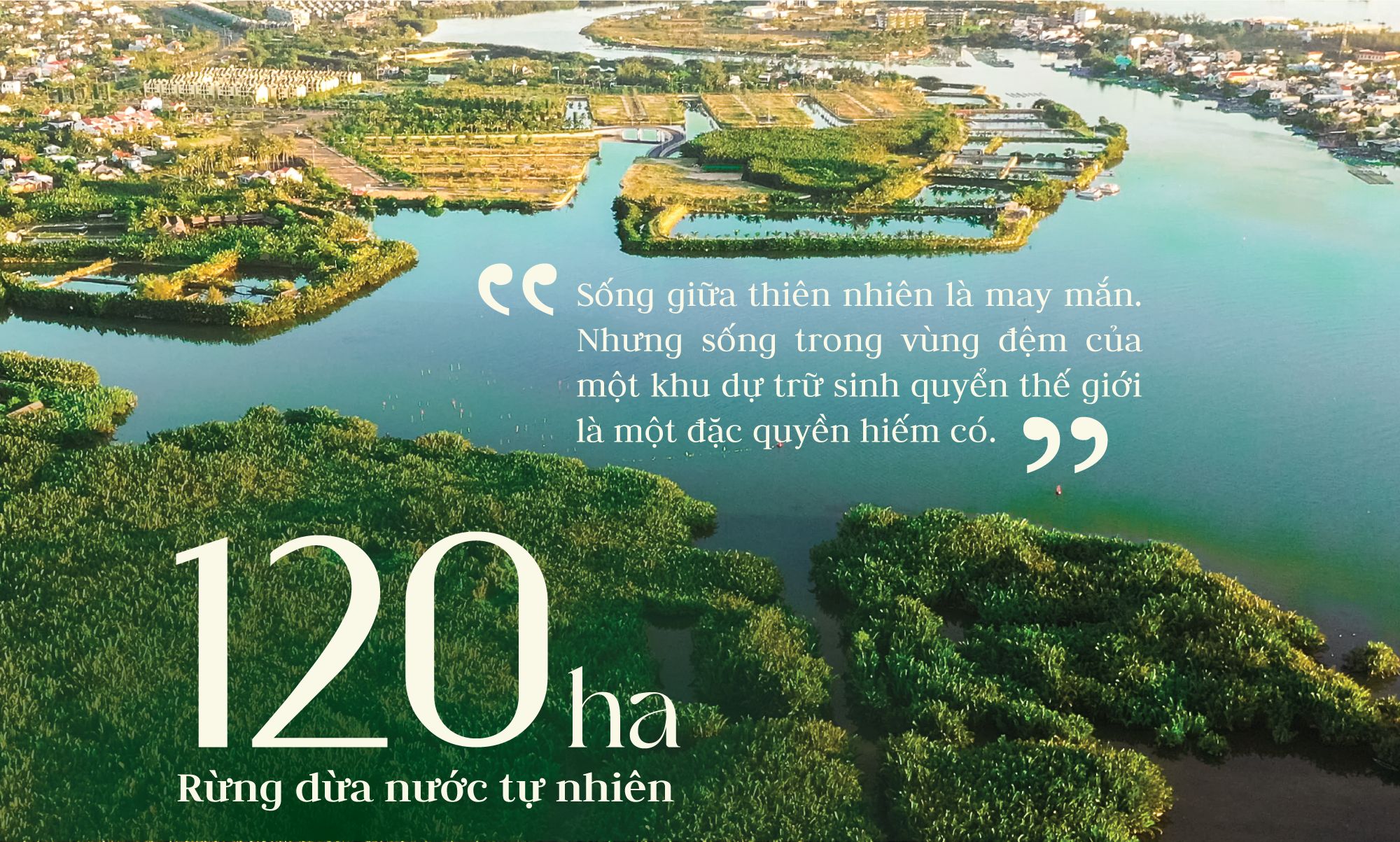 Điểm nhấn ấn tượng là 3,6ha rừng dừa nước tự nhiên được giữ gìn trọn vẹn như một phần linh hồn miền đất, cùng với 8ha cây xanh của cau, dừa nước, hoa giấy… và mặt nước được đan cài tinh tế trong từng không gian sống. Tất cả đã tạo thành một quần thể thực vật nhiệt đới đa dạng mang đặc trưng địa phương rõ nét.