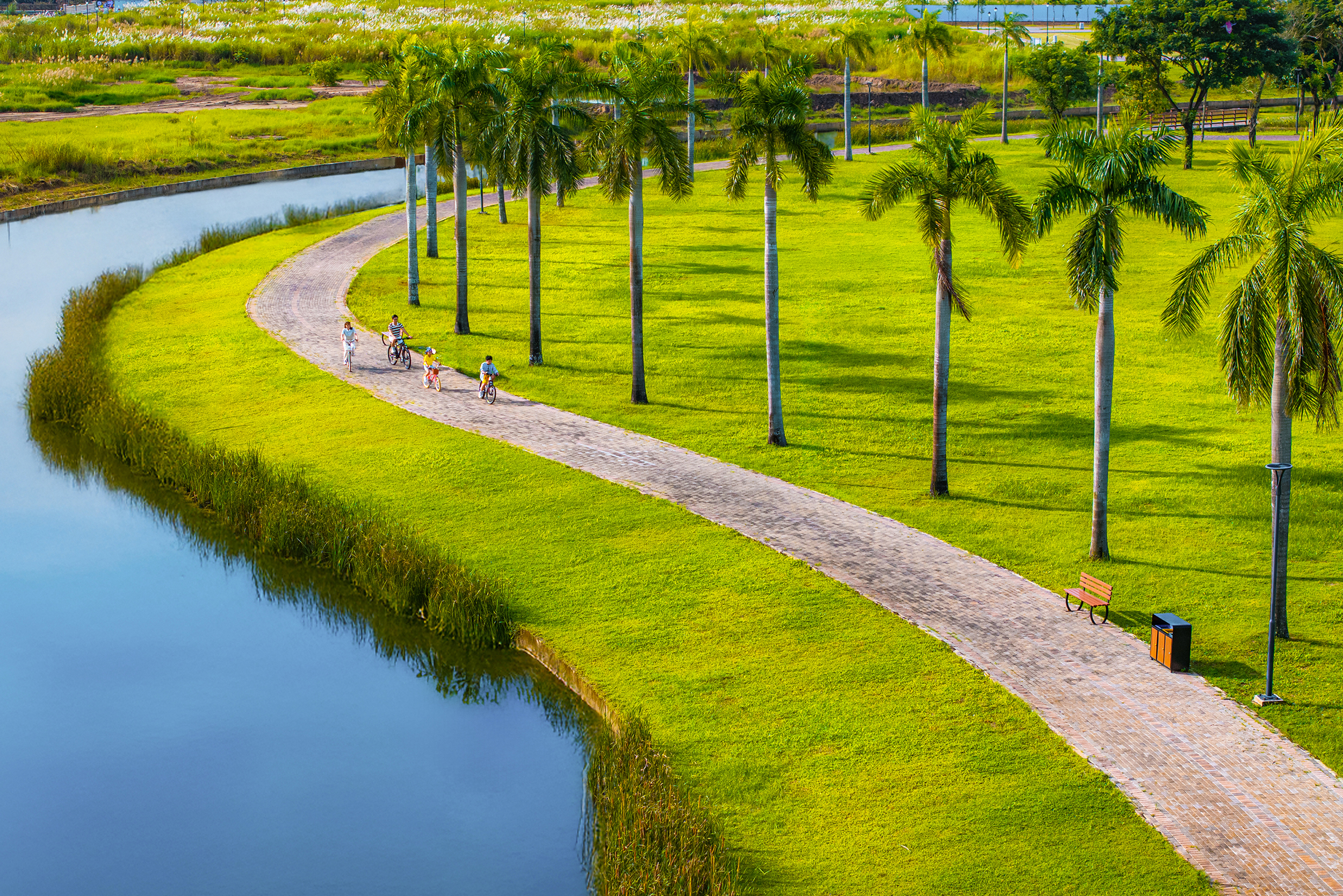 Nối tiếp gam màu của dòng sông là những "dải lụa xanh" từ hệ thống 5 lớp công viên quy hoạch phân lớp từ ven sông, ven kênh, đến từng ô vườn (pocket park) xen giữa các cụm biệt thự, các lối tản bộ rợp bóng cây. Mật độ xây dựng của khu compound chỉ khoảng 17%, phần lớn diện tích được tập trung phát triển hệ sinh thái tự nhiên và tiện ích, nơi con người sống rộng mở cùng thiên nhiên và thiên nhiên là một phần không thể tách rời.