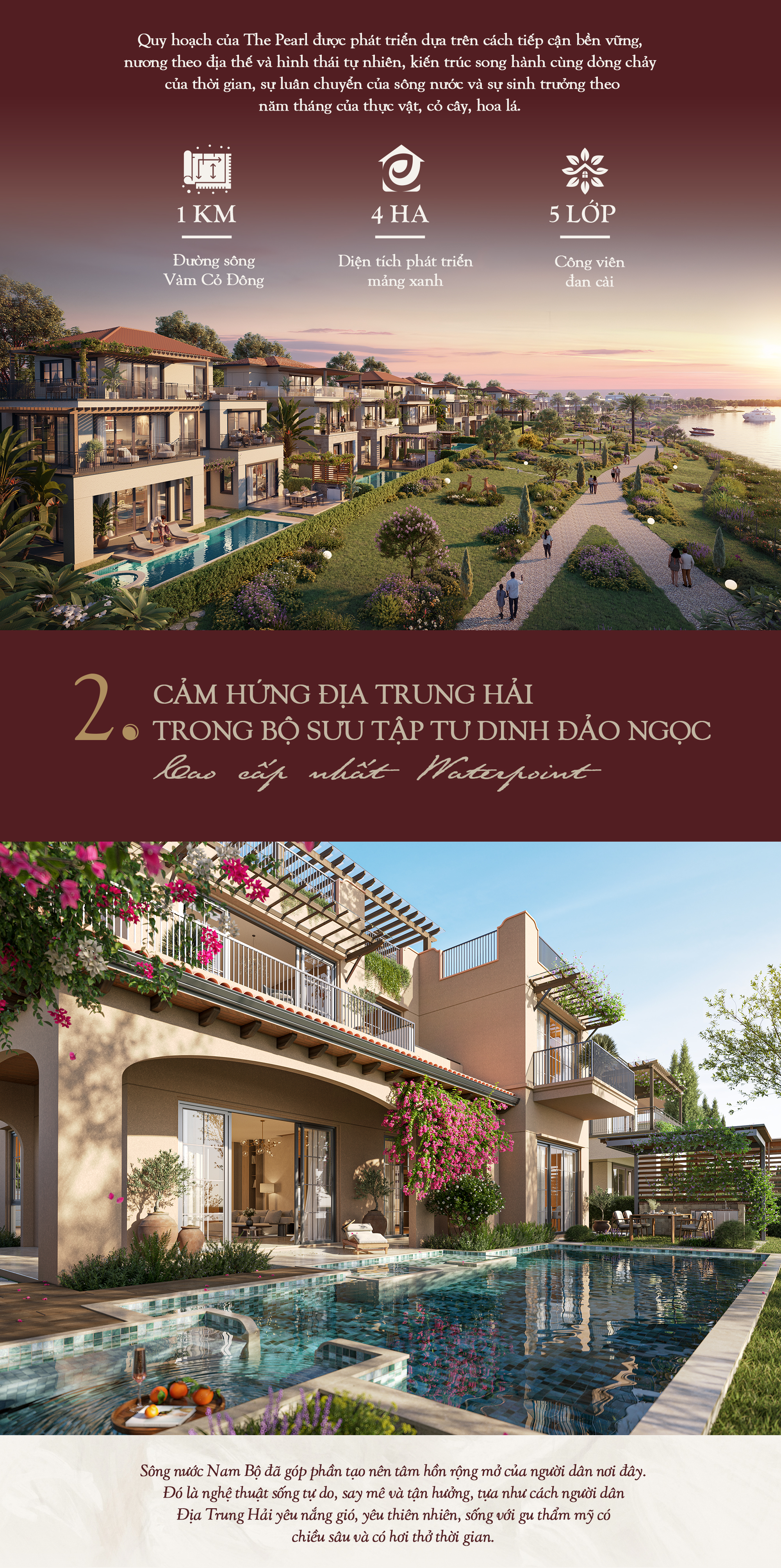 Thiết tha kết nối và giao hòa với thiên nhiên của người Nam Bộ gợi nhắc về tinh thần chan hòa trong nắng ấm, gió mát của những biệt thự nghỉ dưỡng bên bờ biển Âu Nam – biểu tượng của kiến trúc Địa Trung Hải. Cuộc gặp gỡ đồng điệu ấy là mạch cảm xúc để Dr. Marcià Codinachs, người được coi là "Mozart của kiến trúc Địa Trung Hải" chắp bút những nét vẽ phóng khoáng đặc trưng Địa Trung Hải nhưng vẫn sang trọng, thanh lịch và giàu bản sắc dành riêng cho bộ sưu tập tư dinh The Pearl.