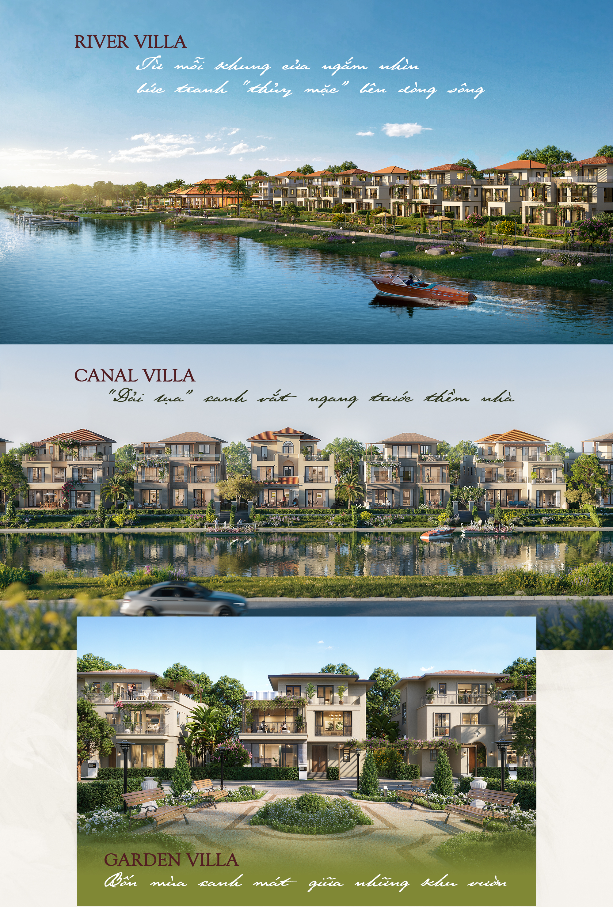 Với tiêu chí hòa quyện với thiên nhiên, không thay đổi cấu trúc tự nhiên vốn có, các biệt thự The Pearl được kiến tác theo đặc điểm của khuôn đất, nương theo độ thoải tự nhiên, nếp uốn của dòng sông và kênh đào để tạo nên những tư dinh mang dấu ấn riêng. 3 loại hình sản phẩm gồm Canal Villa bên kênh đào, River Villa bên sông và Garden Villa giữa những khu vườn xanh… còn phản ánh tinh thần cá nhân hóa, để mỗi chủ nhân tìm thấy sự cộng hưởng giữa gu thẩm mỹ và phong cách sống riêng.