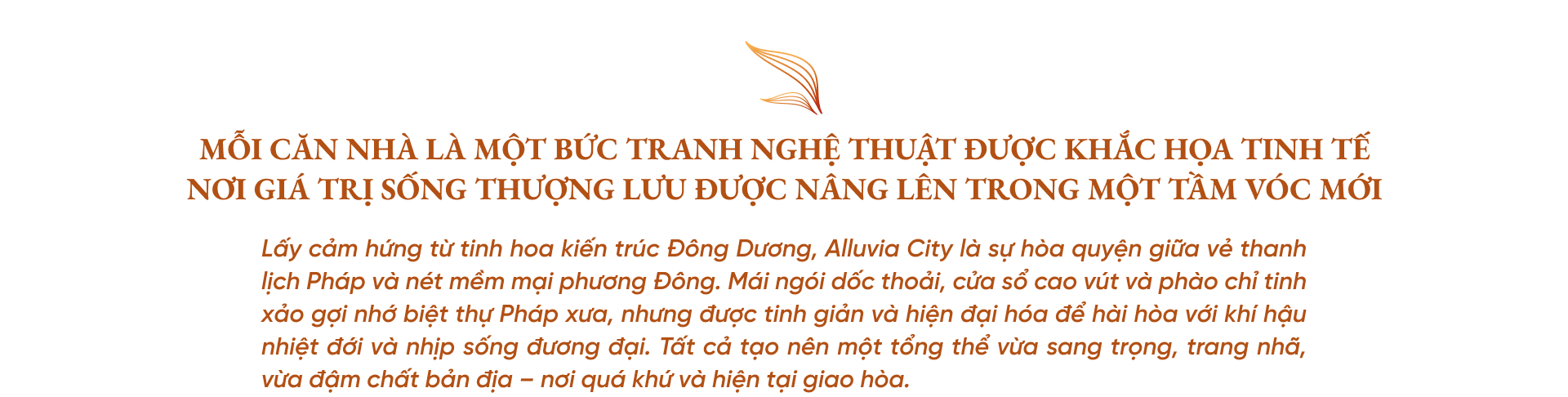 Tại Alluvia City, từng chi tiết hạ tầng và kiến trúc đều được chăm chút tinh xảo: đá tự nhiên nhập khẩu lát vỉa hè và lòng đường theo chuẩn đô thị châu Âu, bền vững, chống trơn trượt và tôn lên vẻ sang trọng hiếm có. Cùng với đó là hệ thống vật liệu hoàn thiện được tinh tuyển kỹ càng, sử dụng công nghệ phục chế của các bảo tàng và cung điện cổ châu Âu, mang đến cho công trình sự bền vững trường tồn với thời gian.