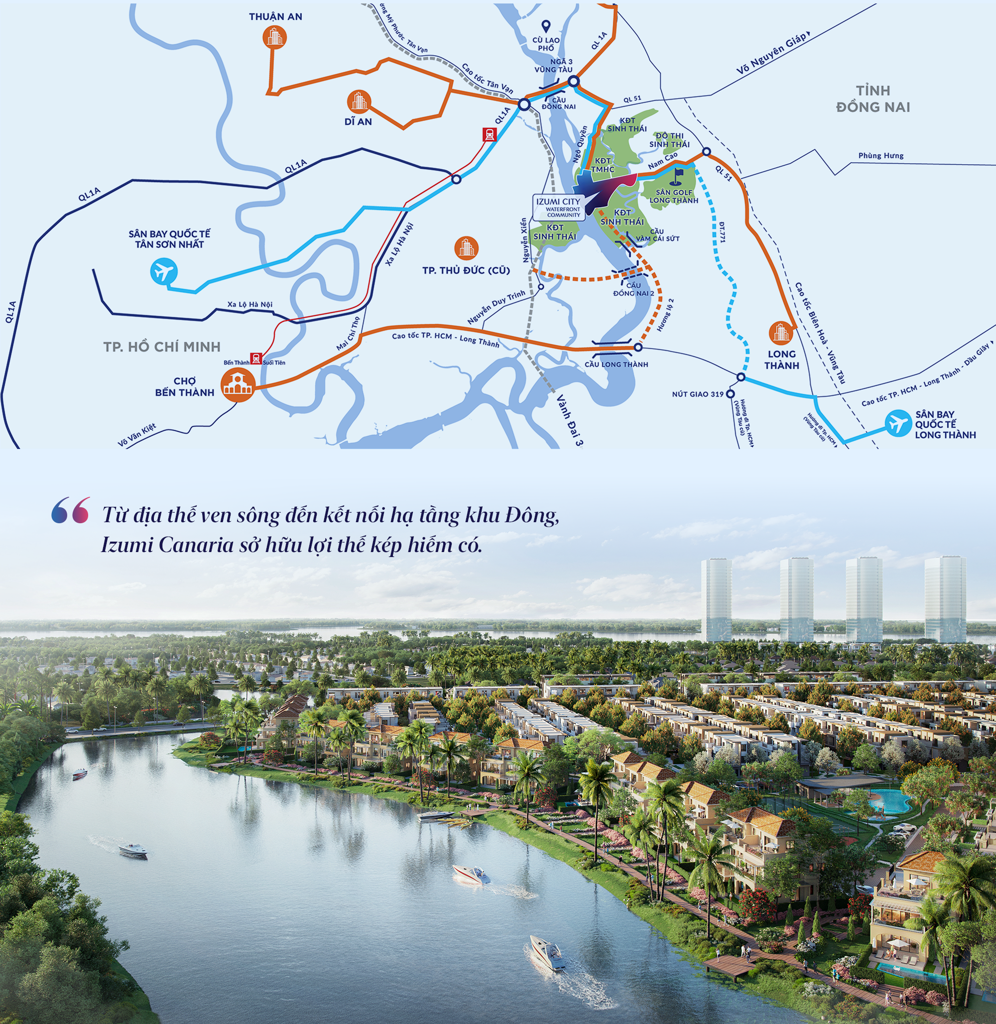 Từ Izumi Canaria, cư dân dễ dàng kết nối theo cả hai trục Đông – Tây và Bắc – Nam: chỉ 30 phút vào trung tâm TP.HCM, thuận lợi di chuyển đến sân bay quốc tế Long Thành, cảng Cái Mép, khu công nghệ cao Thủ Đức hay các khu công nghiệp lớn tại Đồng Nai và Bình Dương. Hệ thống cao tốc, vành đai 3 – 4 cùng tuyến metro số 1 mở ra mạng lưới liên kết vùng hoàn chỉnh, kết nối trực tiếp TP.HCM – Biên Hòa – Vũng Tàu và toàn bộ miền Đông Nam Bộ.