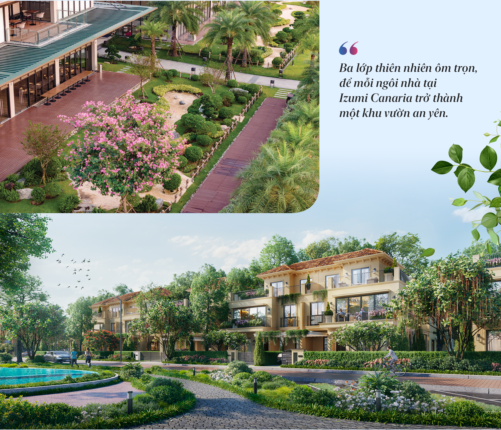 Izumi Canaria kiến tạo triết lý "3 lớp thiên nhiên ôm trọn cuộc sống": Vườn bên nhà – Nhà bên sông – Phố kề sông. Từ vườn nhỏ riêng tư nơi hiên nhà, đến những dãy phố mở tầm nhìn ra mặt nước và cuối cùng là hệ cảnh quan ven sông – tất cả đan cài để mỗi bước chân đều chạm thiên nhiên.